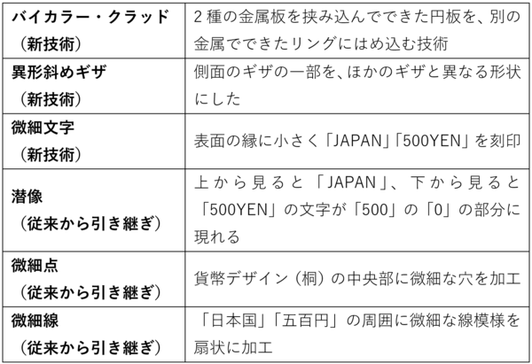 【新500円玉に施された偽造防止技術】