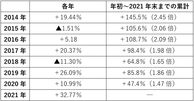 全世界株式の2014年~2021年のリターンは以下の通りです。2015年・2018年はマイナスですが、その他の年は全てプラスとなり、7年間の累計では+145.5%の上昇となりました。
