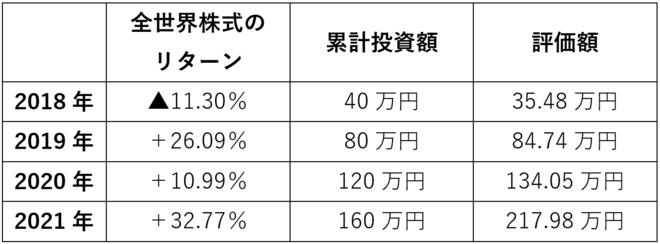 シミュレーションのため、各年初に投資上限40万円を投資したと仮定すると、リターンは以下のようになります。2018年はマイナスですが、2021年末には約218万円になりました。4年間の累計投資額は160万円なので、36%以上お金を増やせた計算です。