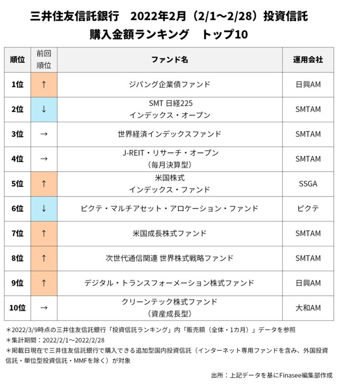 2022年2月、三井住友信託銀行で多くの資金を集めたのは以下のファンドだった。