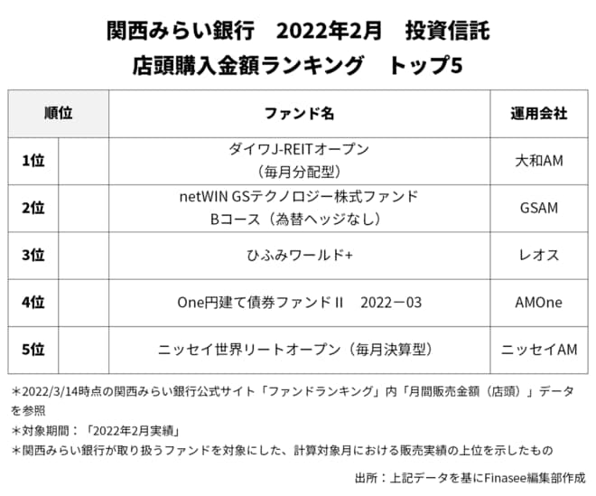 2022年2月、関西みらい銀行で多くの資金を集めたのは以下のファンドだった。