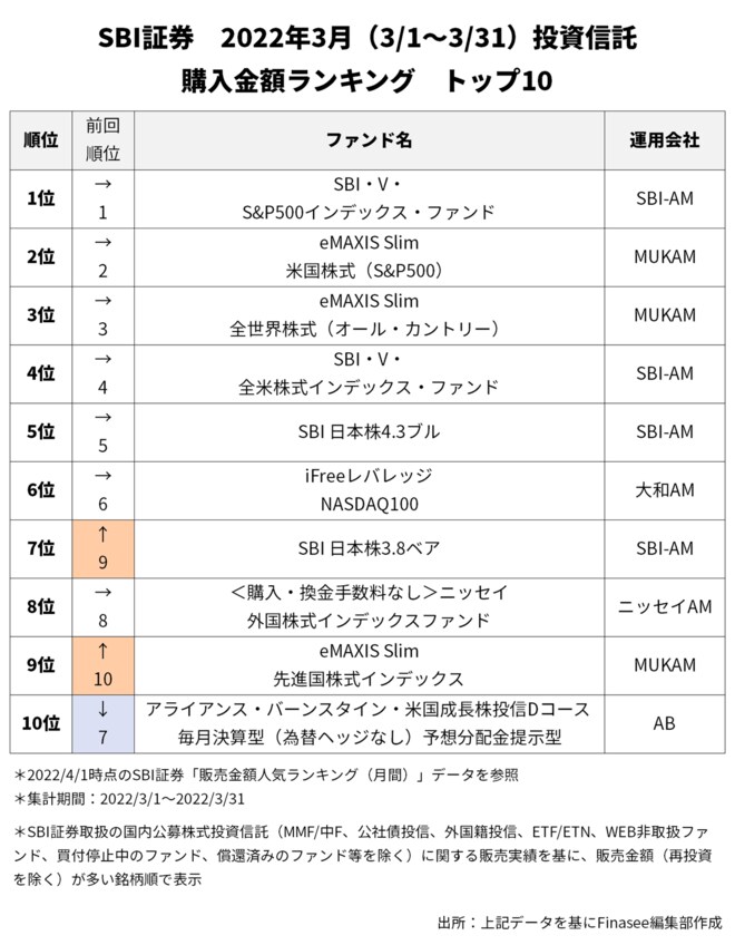 2022年3月、SBI証券で多くの資金を集めたのは以下のファンドだった。