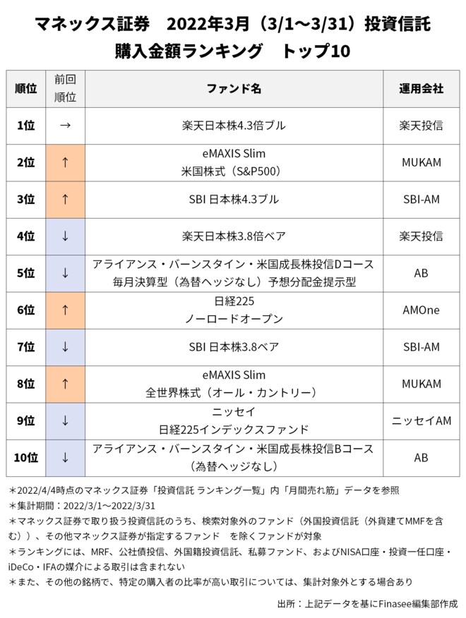 2022年3月、マネックス証券で多くの資金を集めたのは以下のファンドだった。
