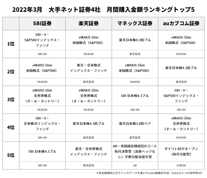 S&P500種株価指数は2月24日に4,114.65ポイントまで下落したが、3月末には4,530.41ポイントまで上昇して取引を終了した。株価が戻り歩調にあるので、4月もネット証券のランキング上位に入る可能性は高いだろう。
