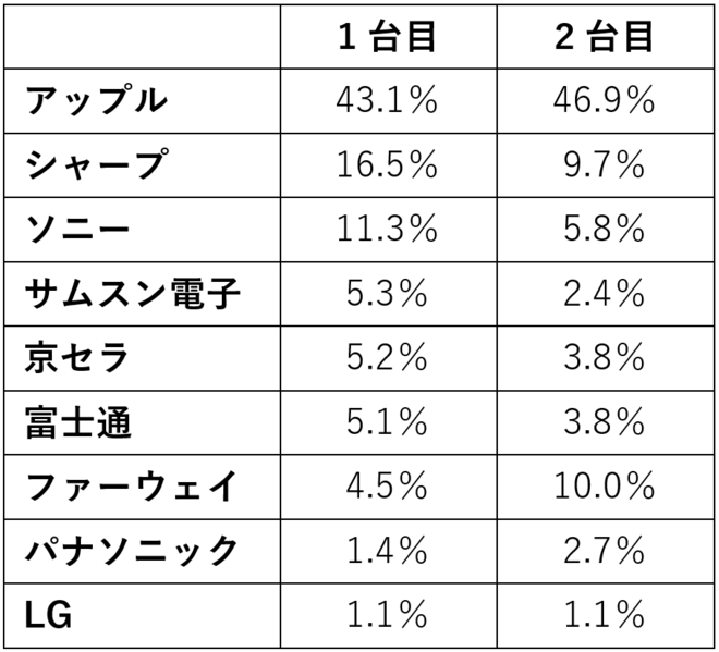 日本はもともと世界的な電機メーカーがあり、フィーチャーフォンでは実績もありましたが、スマートフォンではアップルを相手にシェアを拡大できていません。アップル製品がいかに人気かがうかがえますね。