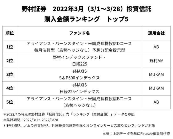 2022年3月、野村証券で多くの資金を集めたのは以下のファンドだった。