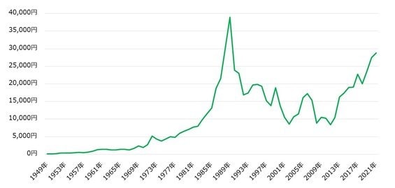 日経平均株価は1950年9月7日から算出が始まりました。ただし指数は1949年5月16日まで遡及して計算されています。176.21円から始まった日経平均株価は順調に上昇し、1989年には過去最高値となる3万8915.87円にまで上昇しました。およそ40年で220倍、1年あたり14.4%のペースで上昇した計算です。