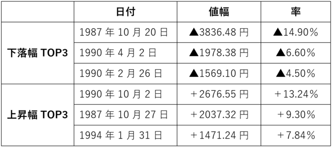 【日経平均株価 1日の下落幅・上昇幅TOP3】