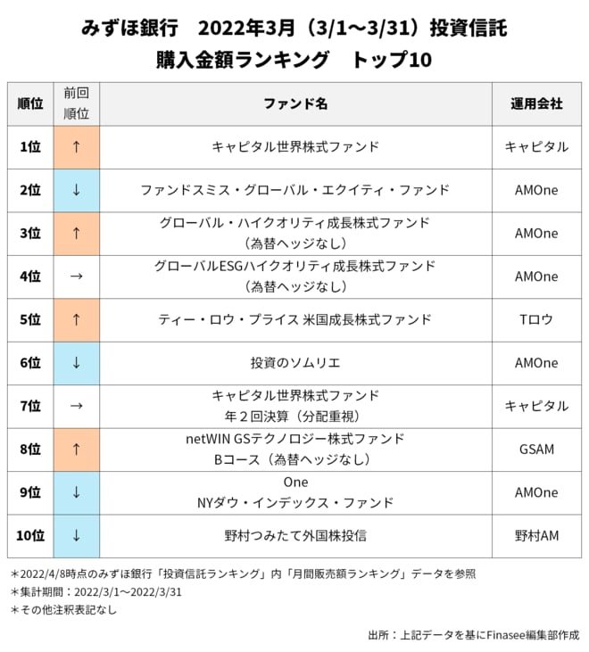 2022年3月、みずほ銀行で多くの資金を集めたのは以下のファンドだった。