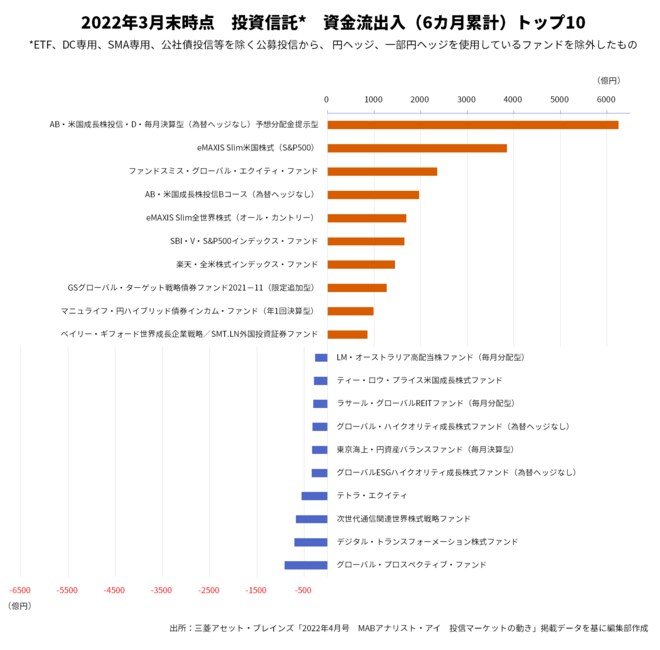 2021年10月~2022年3月の6カ月資金流入額トップは、「アライアンス・バーンスタイン・米国成長株投信Dコース毎月決算型(為替ヘッジなし)予想分配金提示型」だった。同ファンドは、マイクロソフトやアマゾン・ドット・コム、アルファベットなど米国の成長株に投資するアクティブファンドである。3月は、「アライアンス・バーンスタイン米国成長株投信シリーズ」が資金流入額の3位と4位にランクインし、「Dコース 毎月決算型(為替ヘッジなし)予想分配金提示型」は612億円、「Bコース(為替ヘッジなし)」は354億円の資金流入があった。3月末時点における「アライアンス・バーンスタイン・米国成長株投信Dコース毎月決算型(為替ヘッジなし)予想分配金提示型」の純資産残高は1兆8,416億円で、国内公募追加型株式投資信託(ETF除く)の中で最大となっている。高水準の資金流入が続いていることから、4月もランキングトップになる可能性は高いだろう。