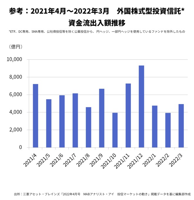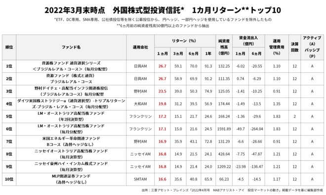 外国株式型の1カ月の騰落率では、「資源株ファンド<ブラジルレアル・コース>(毎月分配型)」が1位となった。また、原油などの資源価格の上昇を受け、資源国関連ファンド(オーストラリア、ブラジルなど)が複数ランクインしている。一方、3月の下位10本はすべてロシア関連ファンドとなっていて、下位3本は下落率が80%を超えている。また、多くのファンドが設定・解約を停止している。特定の国・地域に投資するのではなく、複数の国・地域や金融商品に分散投資してリスクを抑えた運用を心がけるようにしたい。