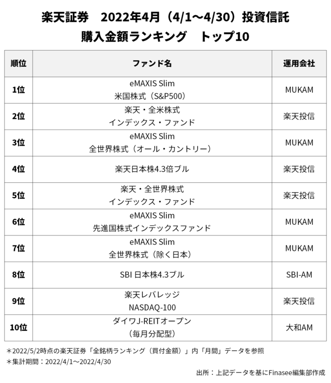 2022年4月、楽天証券で多くの資金を集めたのは以下のファンドだった。