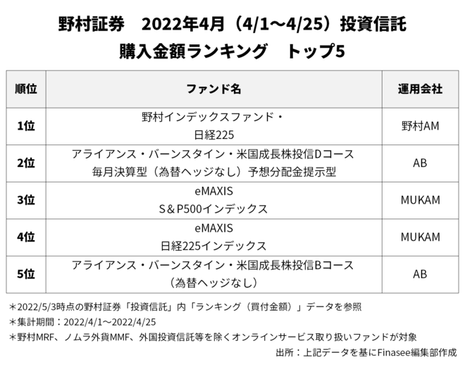 2022年4月、野村証券で多くの資金を集めたのは以下のファンドだった。