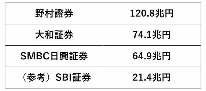 インターネットでは圧倒的なシェアを獲得しているSBI証券ですが、対面型の大手証券会社と比較すると預かり資産で大きな差を付けられています。ネット最大手のSBI証券をもってしてもこれら大手証券会社の牙城を崩すのは簡単ではなさそうです。