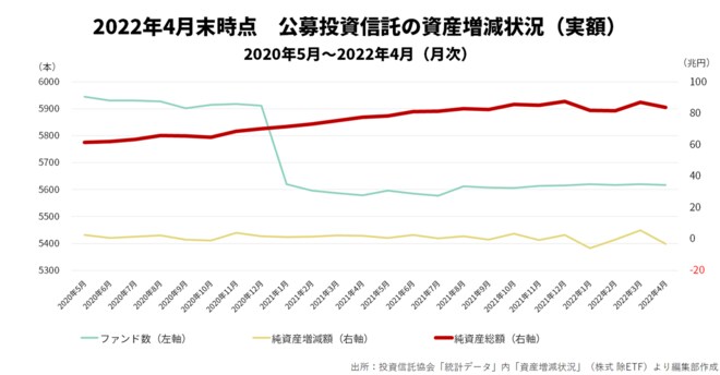 公募株式投資信託(ETFを除く)の純資産総額は2カ月ぶりに減少
