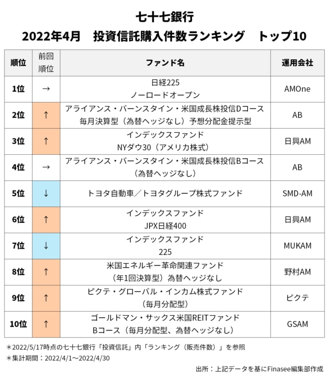 2022年4月、七十七銀行で多くの資金を集めたのは以下のファンドだった。