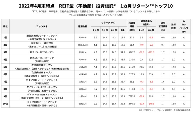REIT型の4月リターン1位は「通貨選択型Jリート・ファンド(毎月分配型)米ドルコース」(5.3%)