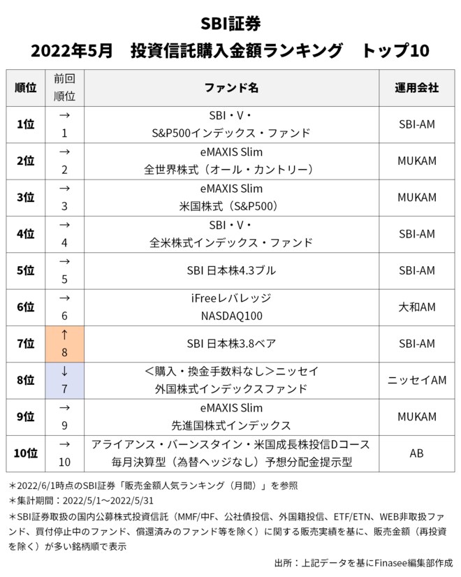 2022年5月、SBI証券で多くの資金を集めたのは以下のファンドだった。