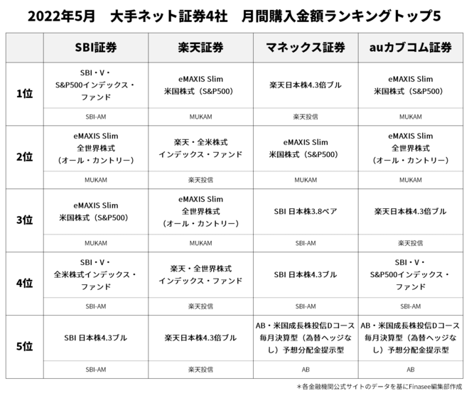 大手ネット証券4社では、5月も外国株式ファンドの人気が高かった。とくに「eMAXIS Slim 米国株式(S&P500)」が人気で、ネット証券各社のランキングは、以下の通り。
