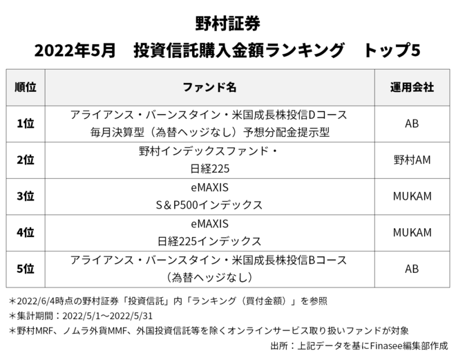 2022年5月、野村証券で多くの資金を集めたのは以下のファンドだった。