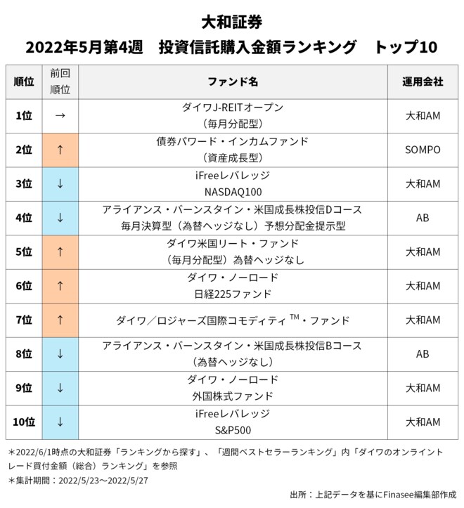2022年5月第4週、大和証券で多くの資金を集めたのは以下のファンドだった。