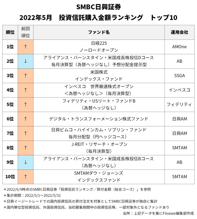 2022年5月、SMBC日興証券で多くの資金を集めたのは以下のファンドだった。