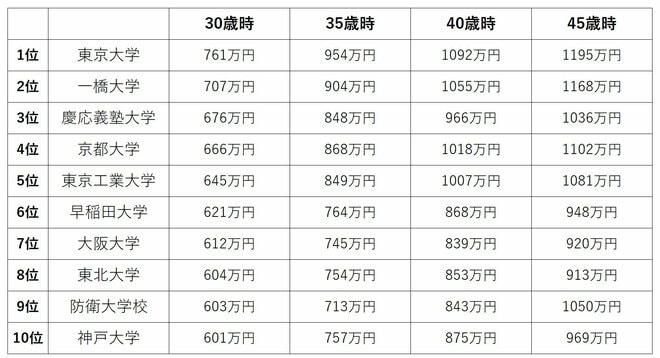 転職・就職プラットフォームを運営するオープンワークによると、東京大学の出身者の想定年収は30歳で761万円、40歳では1092万円となるようです。30歳時の想定年収ランキングでは対象の291校で首位となりました。