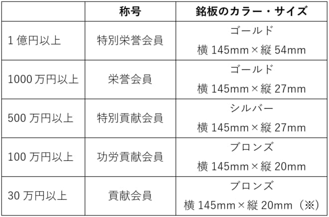 【寄付額に対する称号と銘板のカラー・サイズ】