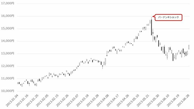 日経平均株価は同年6月13日に1万2415.85円の安値を付け下げ止まりました。バーナンキショック直前の終値は1万5627.26円ですから、1カ月足らずで20%以上も下落したことになります。