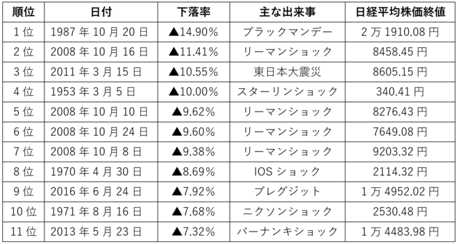 バーナンキ氏の発言は株式の売りを誘います。アベノミクスで上昇していた日本株式にも売りが波及し、日経平均株価は前日比で1143.28円もの下落を記録しました。1日の下落率は戦後11位にランクインしています。