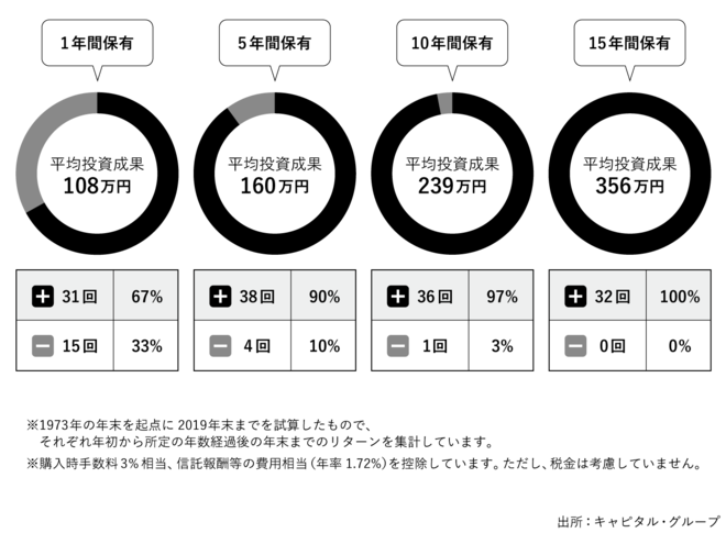 ある全世界株式に投資する投資信託を例に見てみましょう。1年間で運用を止めてしまうと、33%の割合でマイナスになりますが、5年で保有するとその可能性は10%まで減り、 10年保有だと3%(リーマンショックの1回のみ)、15年持ち続けるとマイナスになる可能性はゼロになることが、過去のデータからわかっています。