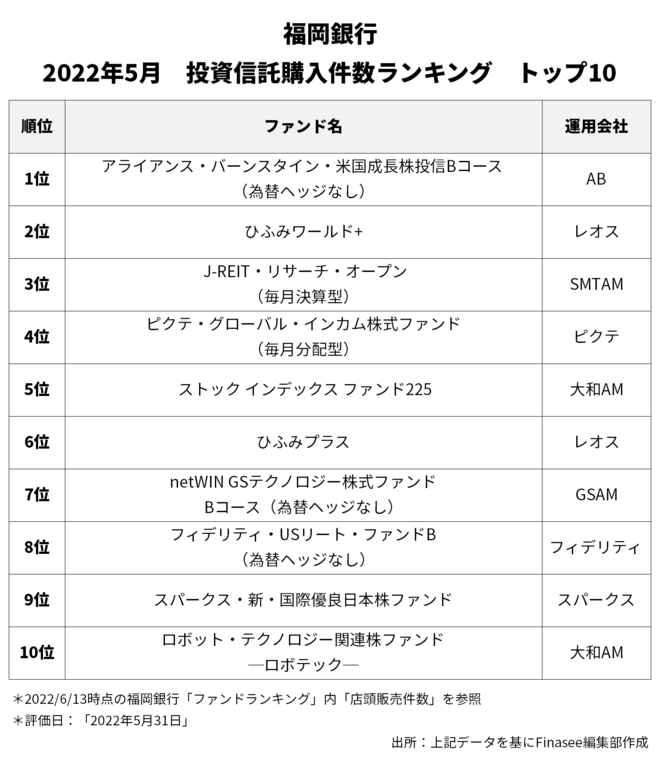 2022年5月、福岡銀行で多くの資金を集めたのは以下のファンドだった。