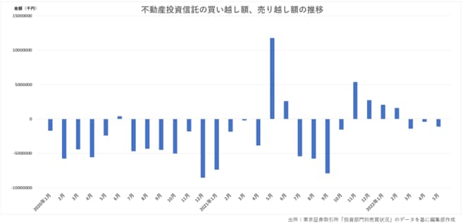 しかし、昨年11月には53億9073万4000円の買い越しに転じ、2022年2月まで4カ月連続の買い越しとなりました。3月、4月、5月は売り越しでしたが、金額的にはかなり小幅に抑えられています。前述したJ-REIT投信の資金流入もそうですが、不動産投資信託市場のセンチメントが、徐々に好転し始めたようです。