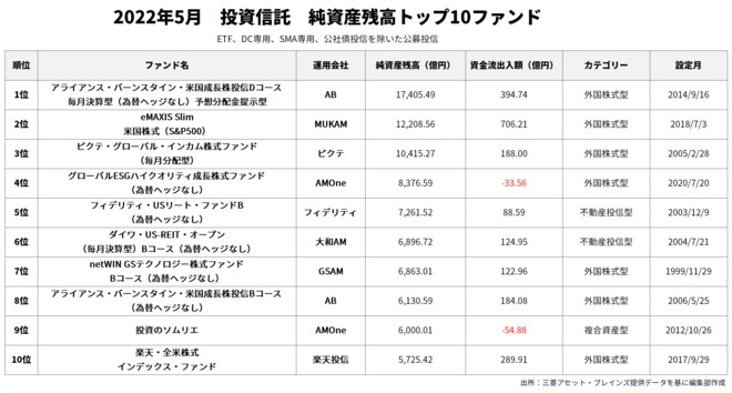 5月の純資産残高トップ(投資信託全体)は「アライアンス・バーンスタイン・米国成長株投信Dコース毎月決算型(為替ヘッジなし)予想分配金提示型」(1兆7,405億円)