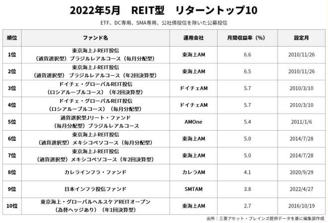 REIT型ファンドの5月リターン1位は「東京海上J-REIT投信(ブラジルレアル)毎月分配型」(6.55%)