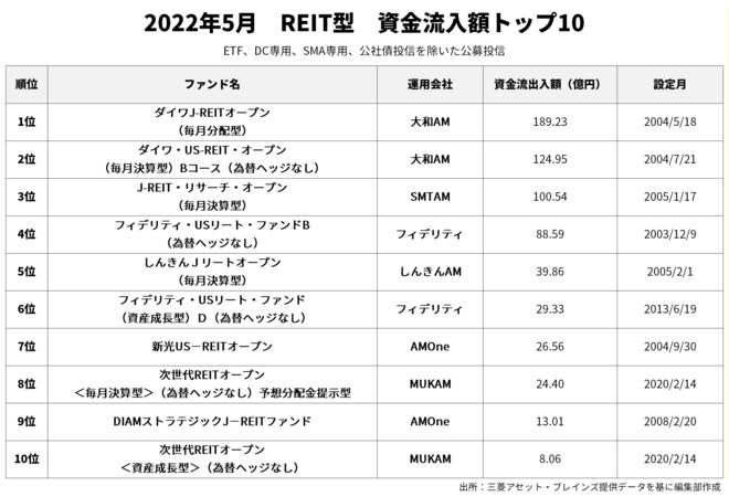 REIT型ファンドの5月資金流入額1位は「ダイワJ-REITオープン(毎月分配型)」(189.23億円)