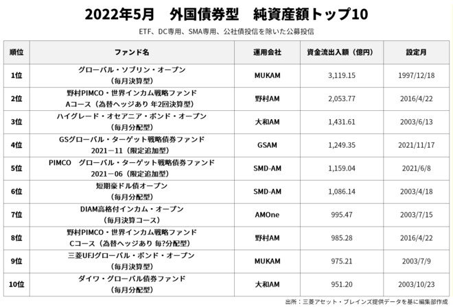 外国債券型5月純資産残高1位は「グローバル・ソブリン・オープン(毎月決算型)」(3,119.15億円)