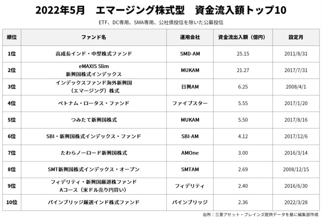 エマージング株式型の5月資金流入額1位は「高成長インド・中型株式ファンド」(25.15億円)