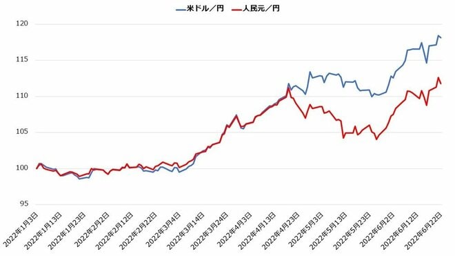 【米ドルと人民元の値動き(2022年1月3日~6月22日)】