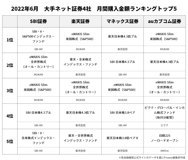 ネット証券では、6月もS&P500種株価指数を対象にしたインデックスファンドの人気が高かった。とくに人気の高い「eMAXIS Slim 米国株式(S&P500)」のネット証券でのランキングは、以下の通り。
