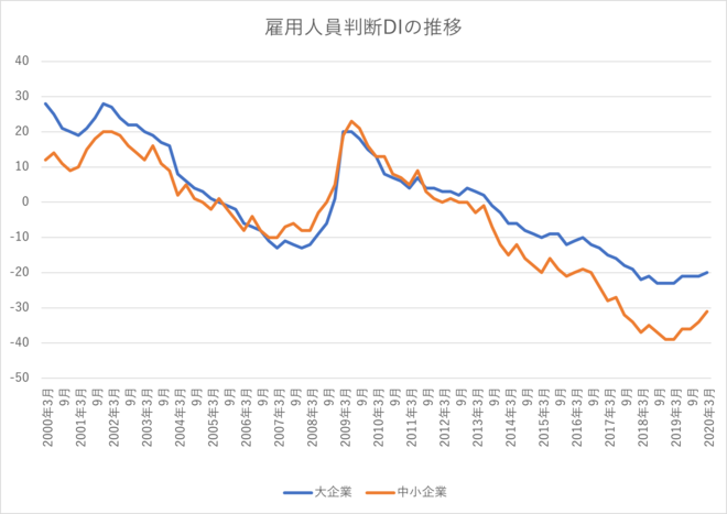 上記の表は、日銀短観の「雇用人員判断DI」(全産業)の推移です。「雇用人員判断DI」とは雇用人員が「過剰」と答えた企業の割合から「不足」と答えた企業の割合を差し引いたもので、雇用人員の過不足を表す数値です。雇用人員判断DIがマイナスの状態は企業の人手不足を意味します。2012年ごろから大企業・中小企業ともに人手不足が拡大し、最近では中小企業でより深刻化しているのが分かります。