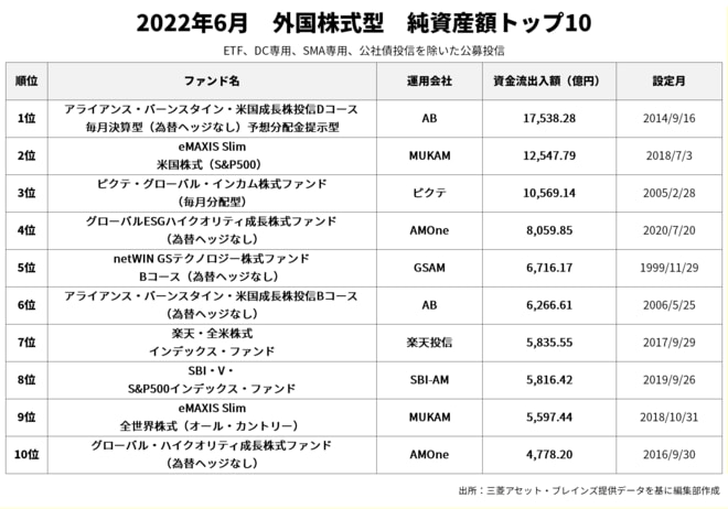 6月の純資産残高1位は「アライアンス・バーンスタイン・米国成長株投信Dコース毎月決算型(為替ヘッジなし)予想分配金提示型」(1兆7,538.28億円)