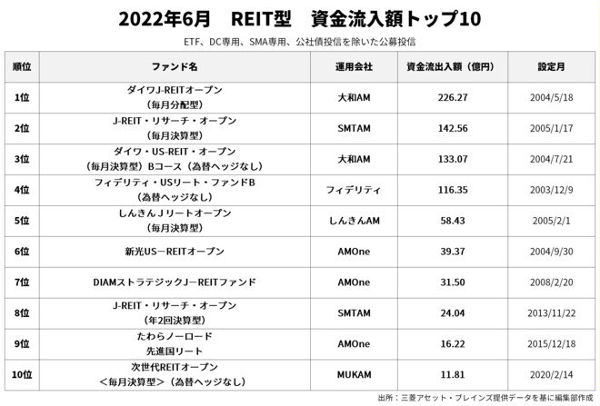 6月の資金流入額1位は「ダイワJ-REITオープン(毎月分配型)」(226.27億円)