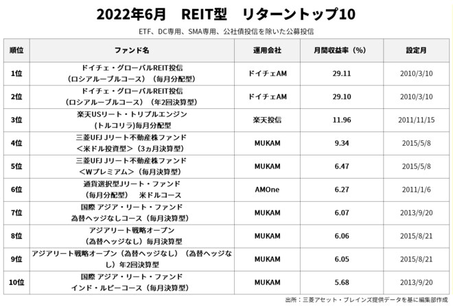 REIT型ファンドの6月リターン1位は、「ドイチェ・グローバルREIT投信(ロシアルーブル(毎月分配型)」だった。同ファンドは、日本を含む世界各国の金融商品取引所に上場しているREITに投資するファンドである。世界のREIT市場は下落したが、円安・ロシアルーブル高が進んだので高いリターンとなった。ただ、同ファンドは2022年3月4日から購入の受付を停止し、現在は換金のみ。さらに、9月9日付で繰上償還することが決定しているので注意が必要だ。