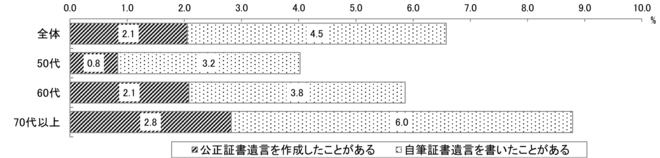 また、遺言書(公正証書遺言、自筆証書遺言のいずれか)を作成した人は全体の6.6%でした。年齢が上がるにつれて作成した人の割合は増えますが、それでも多いとはいえません。