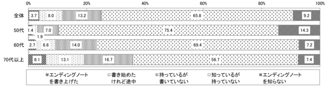 まず、エンディングノートを書いたことがあるかという質問に対して、「書き上げた」と回答したのは全体のわずか3.7%の人でした。「書いている」とした人も8.0%、「持っているが書いていない」人が13.2%で、「知っているが持っていない」人が全体の65.8%と圧倒的多数を占めていました。70代以上になると、やや、エンディングノートを持っている、書いている人の割合は増えますが、やはり「知っているが持っていない」人が大勢を占めます。
