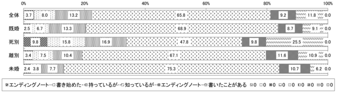 女性の方が男性よりも書いている割合が高いのですが、特に配偶者と死別した人は、既婚、離別、未婚の人と比べて、男女ともにエンディングノートを書いている割合が高いのです。