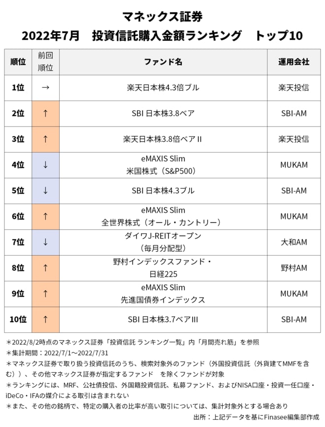 2022年7月、マネックス証券で多くの資金を集めたのは以下のファンドだった。