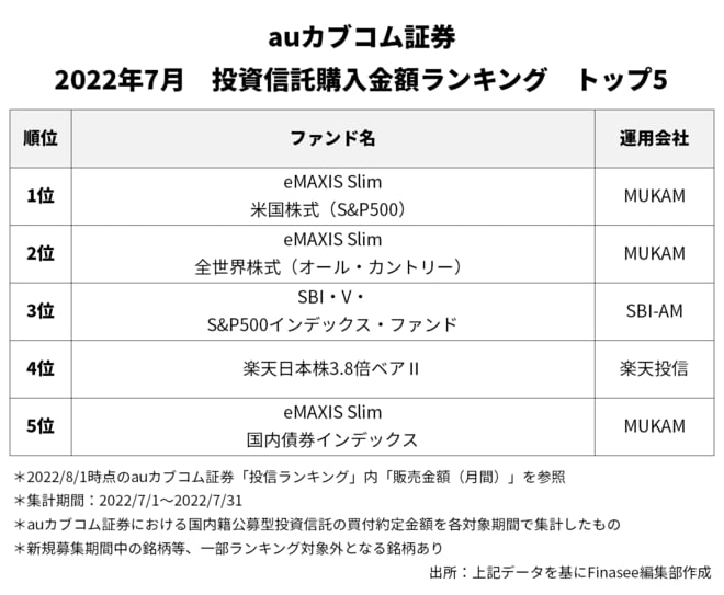 2022年7月、auカブコム証券で多くの資金を集めたのは以下のファンドだった。