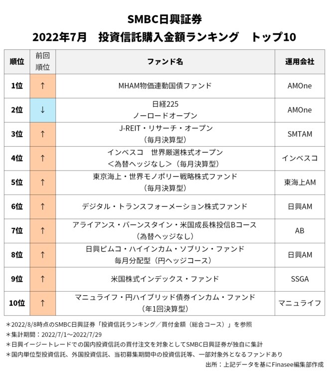 2022年7月、SMBC日興証券で多くの資金を集めたのは以下のファンドだった。